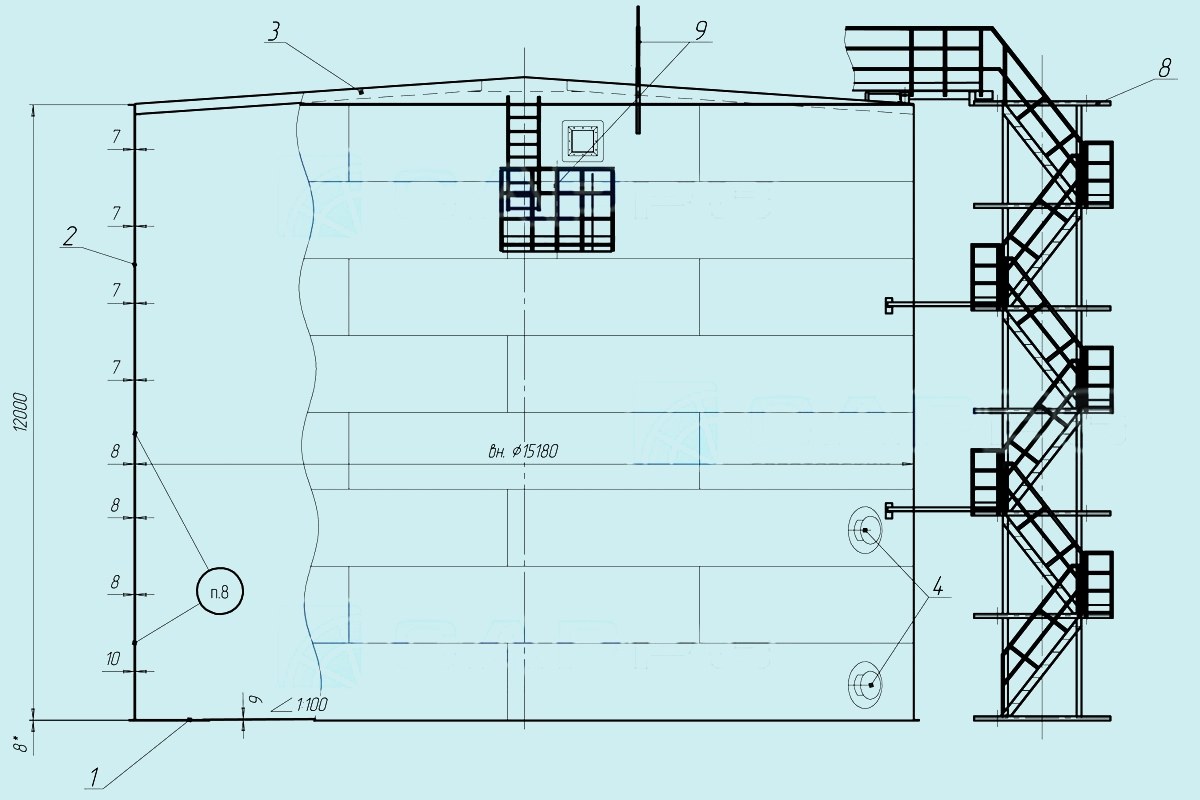 1- днище, 2 - стенка, 3 - крыша коническая щитовая, 4 - люки и патрубки, 5 - люки и патрубки, 6 - понтон алюминиевый, 7 - площадка с ограждением, 8 - лестница шахтная, 9 - комплектующие конструкции (молниеприемник, крепления заземления, площадка обслуживания пеногенераторов)